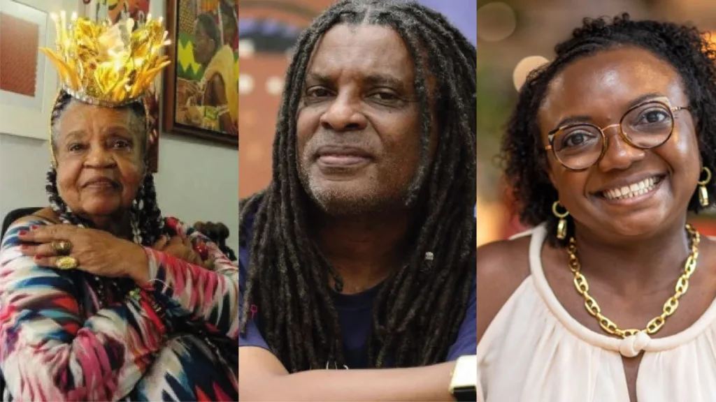 Homenageados da sexta edição do Festival Fala!, Lydia Garcia (à esquerda) e Nelson Inocêncio (ao centro). À direita, a jornalista convidada Rosane Borges/ Créditos: Divulgação